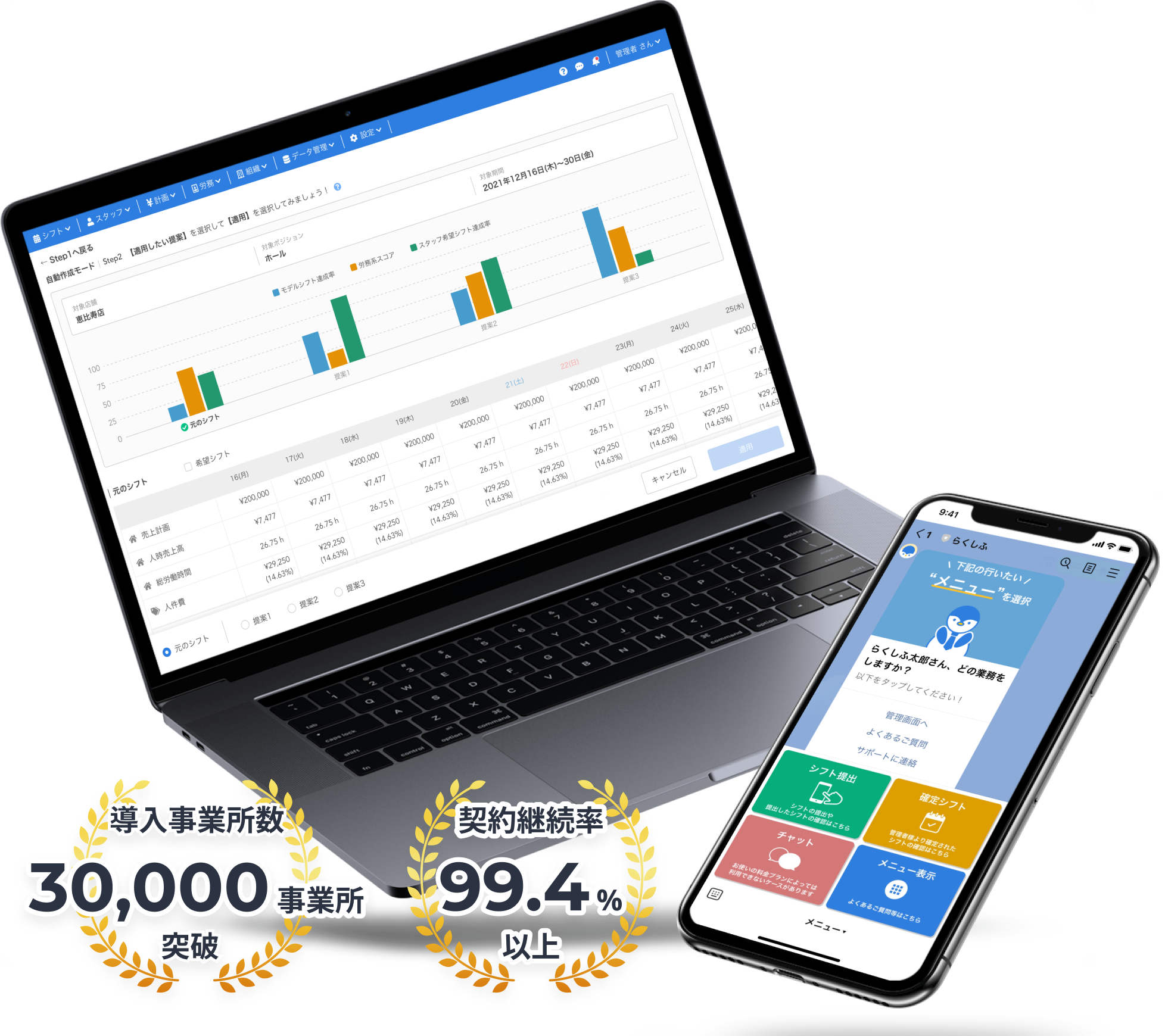 「らくしふ」は、シェアNo.1※のシフト管理システムです。時間と手間の掛かるシフトの回収〜作成〜共有を「らくしふ」で完結可能で、シフト作成時間を大幅に短縮します。加えて、売上や客数予測、人件費などのデータを活用し、最適なスタッフ配置を実現します。複数店舗・事業所の一括管理やヘルプ調整時間削減にも貢献でき、飲食店をはじめとした外食や小売、ホテル、介護など様々な業種・業態のシフト管理の課題解決に向けサポートしています。