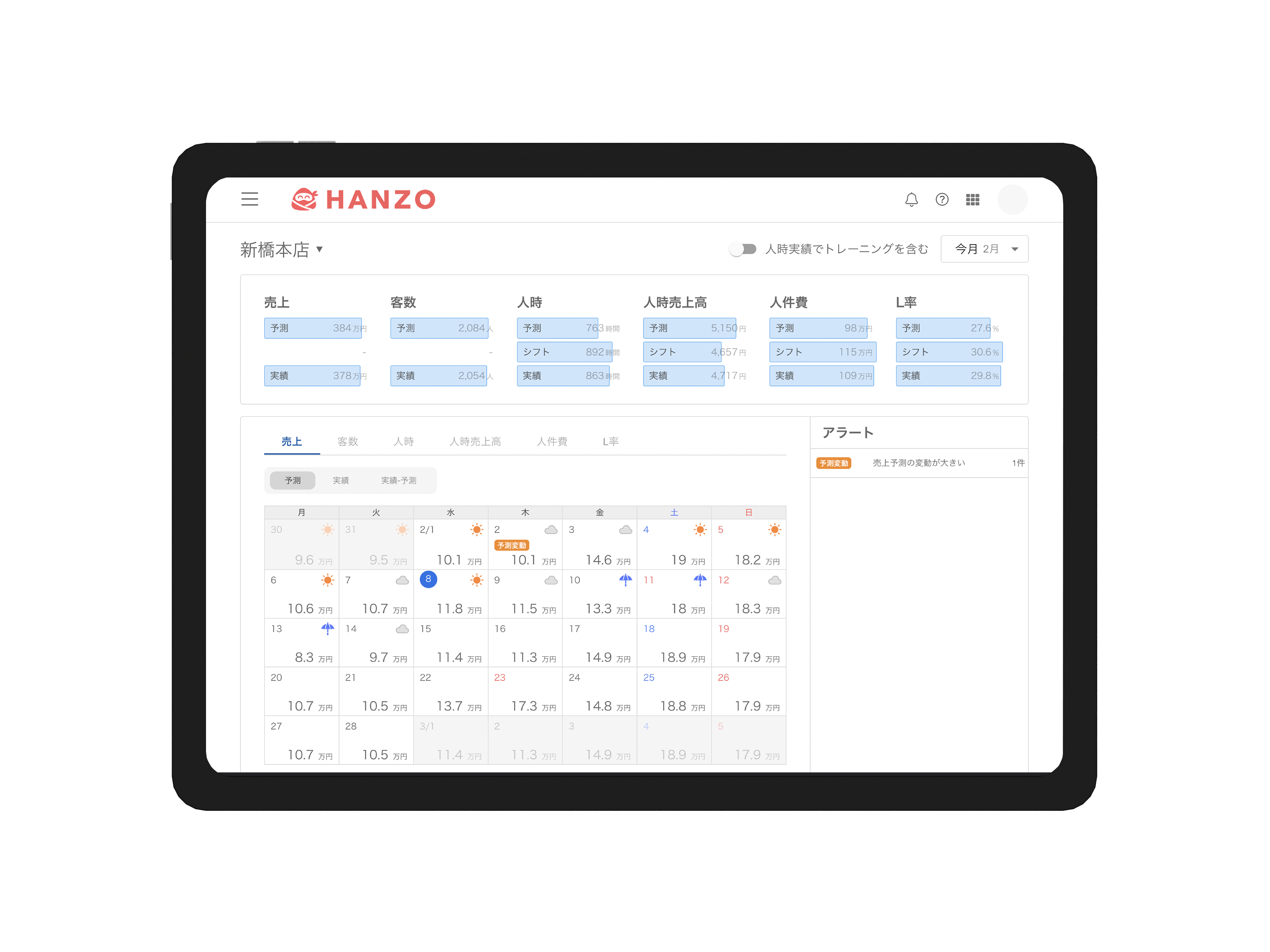 当社が飲食店向けに提供する「HANZO 人件費」は売上と客数の予測や、売上に対する最適な必要人員数の算出をAIが自動で行うため、店舗担当者のスキルや経験に左右されずデータに基づいた最適なシフト作成を可能にします。