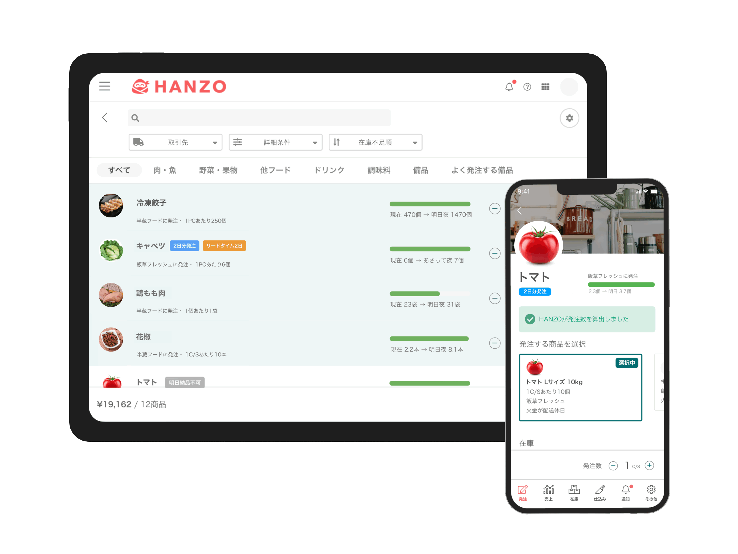 「HANZO 自動発注」は、売上や客数の予測を行って食材消費量を計算し、理論在庫データの情報を照合することで最適な発注量を算出し、自動で発注を行います。
