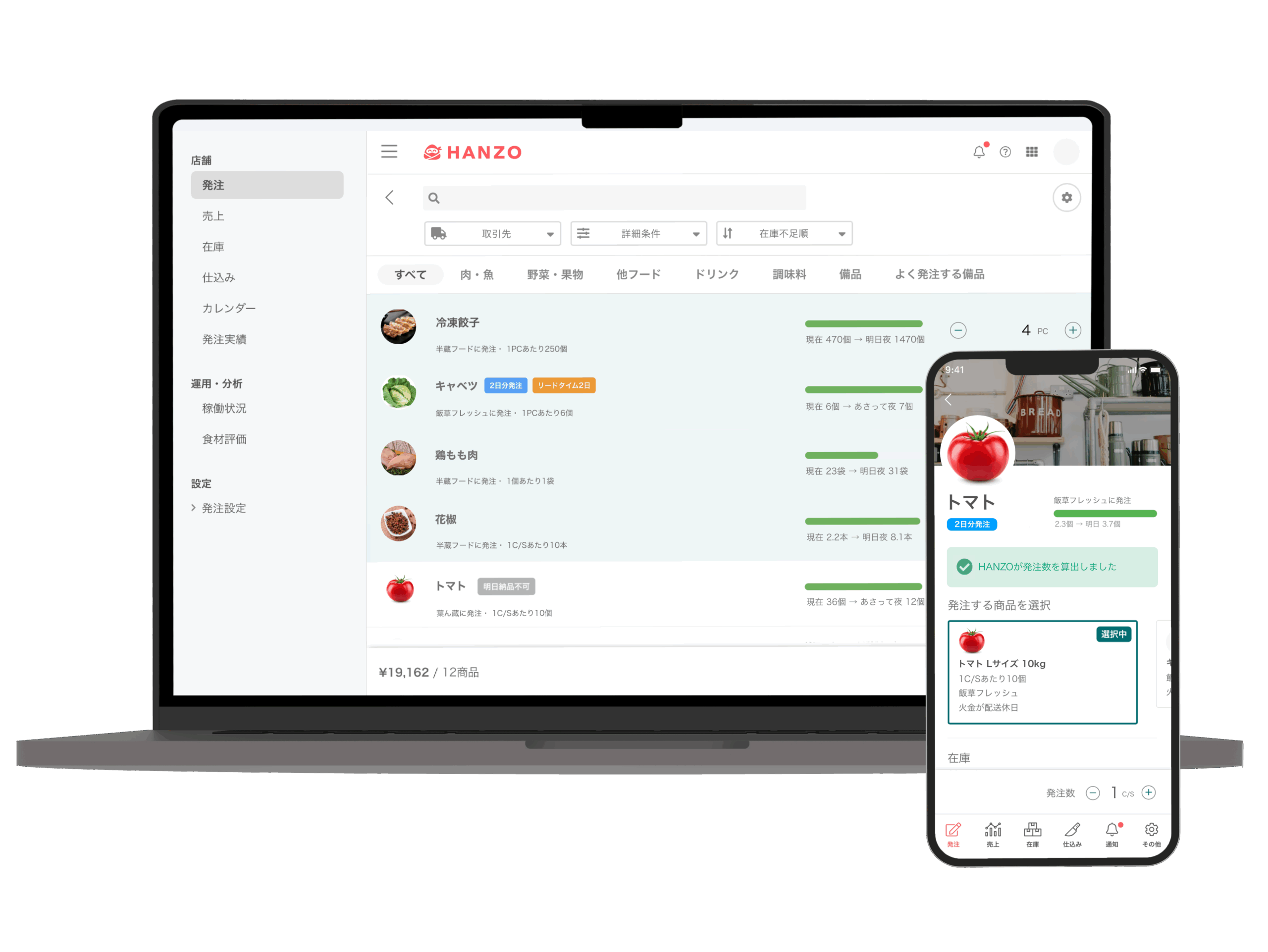 「HANZO 自動発注」は、新任店長や異動直後の店長でも迷うことなく発注が可能となり、発注業務の属人化を解消するとともに、店長の負担軽減にもつながります。さらに、AIが売上傾向や天候などのデータをもとに適正な発注量を算出することで、過剰・過少発注を防ぎ、食材ロスや品切れの削減にも貢献します。