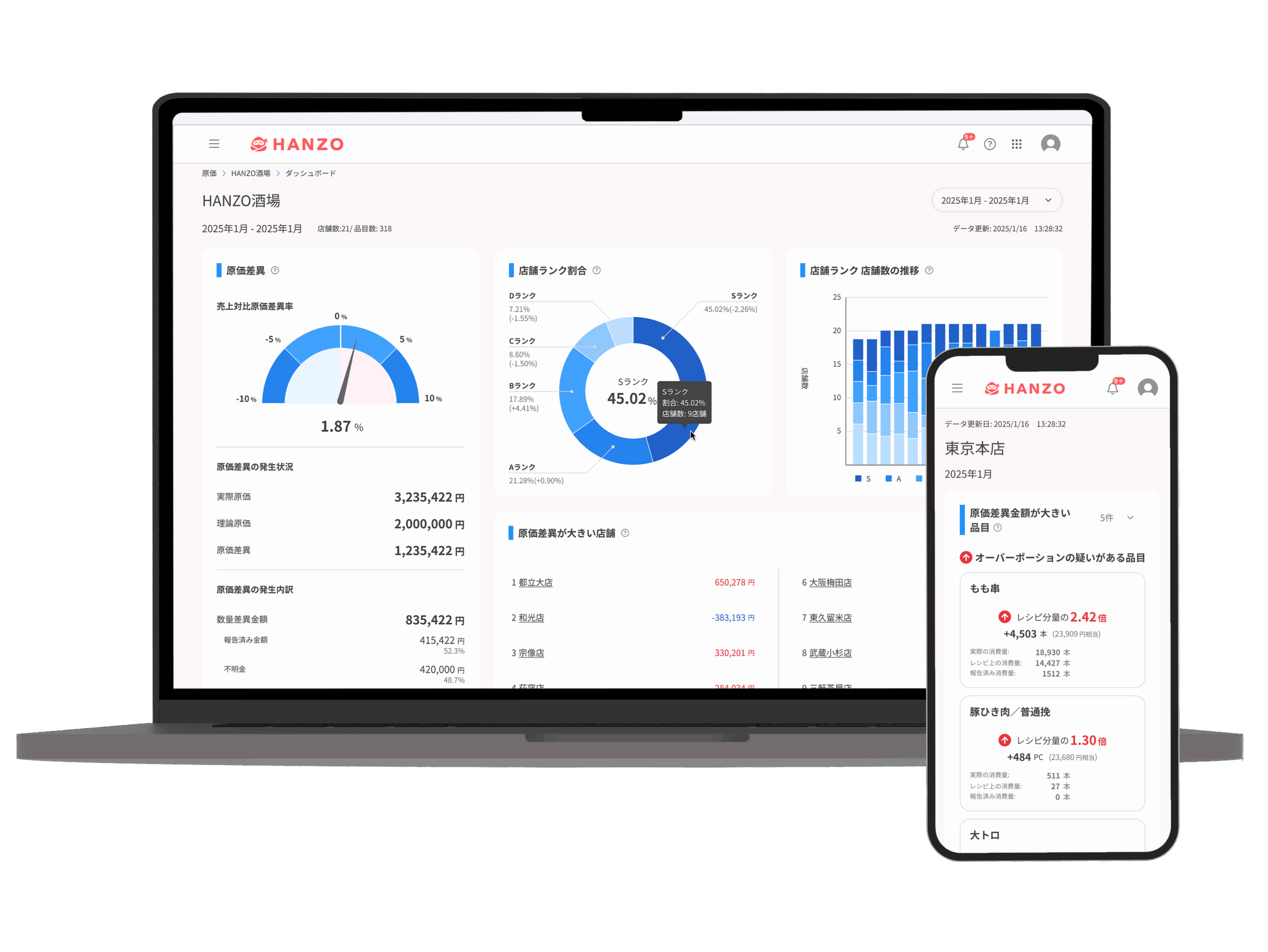 「HANZO 原価分析」は食材別の仕入れ、棚卸、理論原価を設定したメニューレシピ、販売管理等のデータを自動連携・集計し、店舗・食材ごとに理論原価と実原価の差分を可視化します。差異と課題箇所を明らかにすることで、原価改善に向けた方針策定を可能にします。